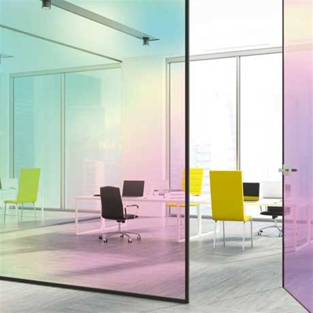 Mit den dichroitischen selbstklebenden Folien von ASLAN werden Glas- und andere ebene Flächen zu echten Hinguckern. Es gibt sie in zwei transparent gefärbten Varianten, die fließend die Farbe wechseln – immer abhängig vom Blickwinkel und den Lichtverhältnissen.